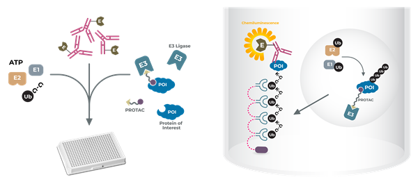 PROTAC Assay Plate是一种基于夹心法的检测方法,其中使用专有的多泛素结合试剂在预涂微孔板的孔中捕获细胞裂解物中的多泛素化蛋白质。